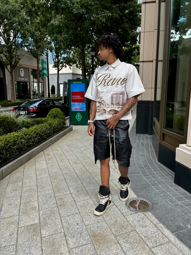 Made from a premium twill and polyester blend, this piece blends structure with smooth comfort. The front features a striking embroidered “Rare” logo layered over an Eiffel Tower cityscape, complete with bridges, buildings, and birds in motion — a nod to ambition and artistry.