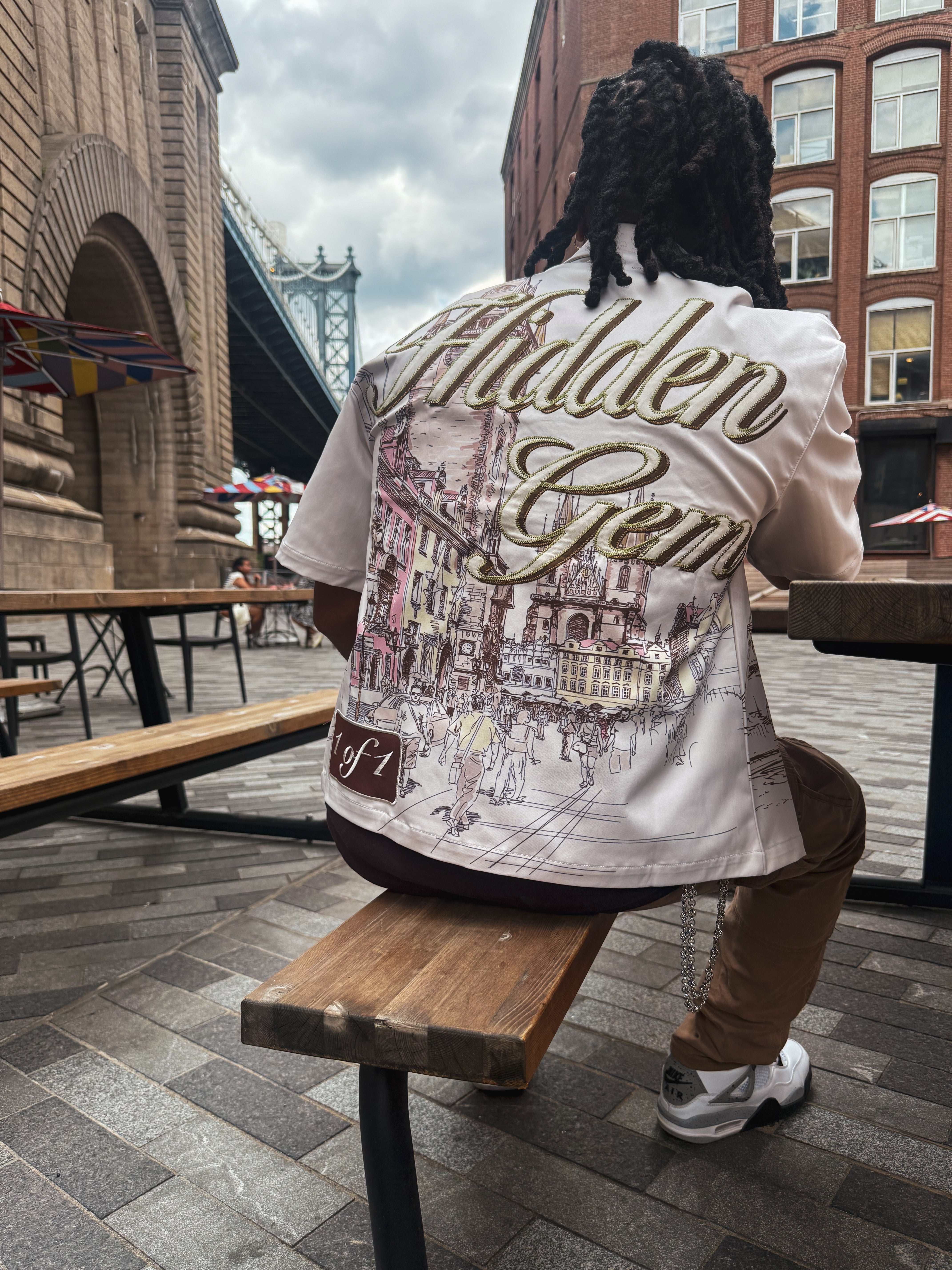 The back reveals a vibrant European street scene, detailed with “Hidden Gem” embroidery and a “1 of 1” mark that captures individuality and exclusivity.
